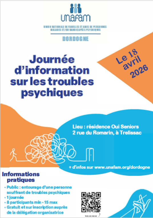 L'UNAFAM Dordogne organise une Journée d'information sur les Troubles Psychiques le samedi 18 avril 2026 de 9h à 17h à Trélissac.